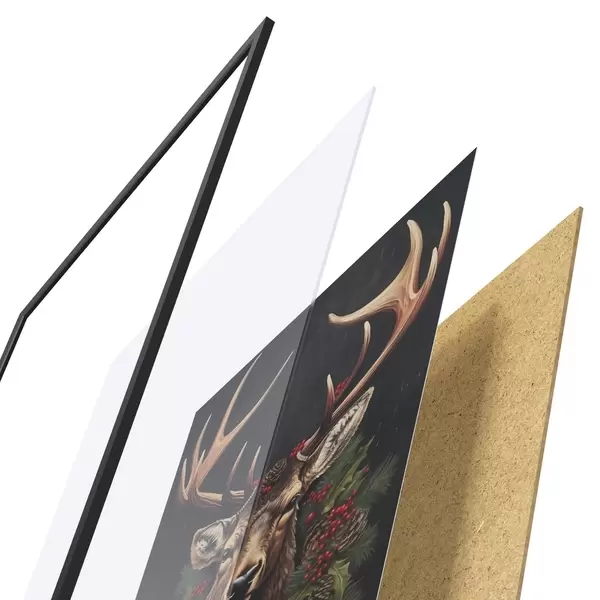 A poszter keretből, plexiből, nyomtatott képből és forgácslap hátlapból áll. A poszter a hátoldalon található rögzítőknek köszönhetően azonnal felakasztható a falra.