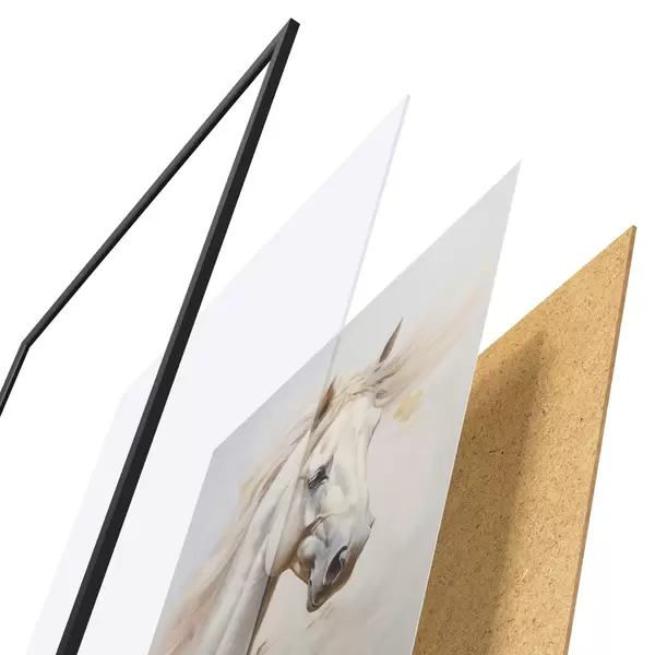 A poszter keretből, plexiből, nyomtatott képből és forgácslap hátlapból áll. A poszter a hátoldalon található rögzítőknek köszönhetően azonnal felakasztható a falra.