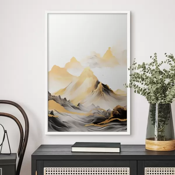 Poster Texturált sárga és fekete hegyek havas csúcsokkal, tusfestés stílusban, minimalista hegylánc Nr f46684
