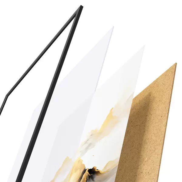 A poszter keretből, plexiből, nyomtatott képből és forgácslap hátlapból áll. A poszter a hátoldalon található rögzítőknek köszönhetően azonnal felakasztható a falra.