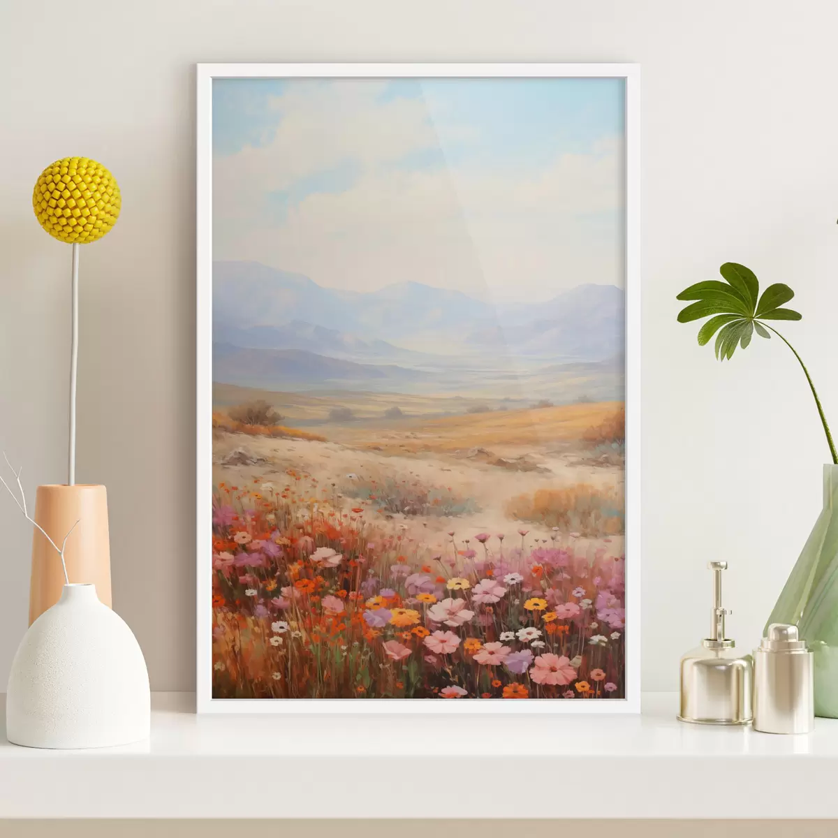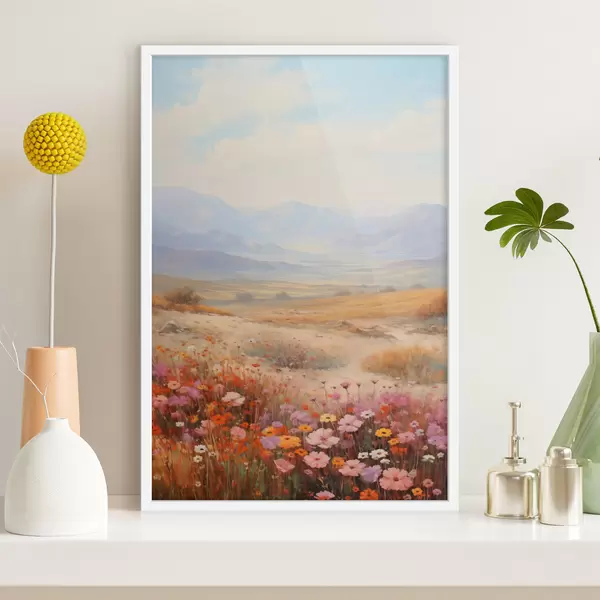 Plakát a sziklán Tájkép, színes virágokkal teli mező, háttérben hegyekkel, lágy, pasztell színekkel f46685