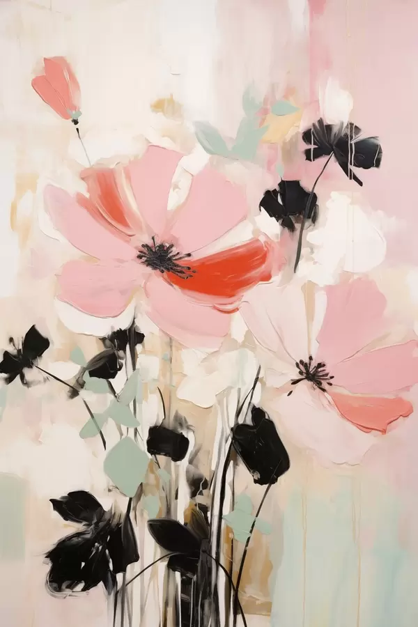 Poster Rózsaszín és fekete virágok levelekkel, lágy pasztell színek, absztrakt virágkompozíció, minimalista művészet Nr f46687