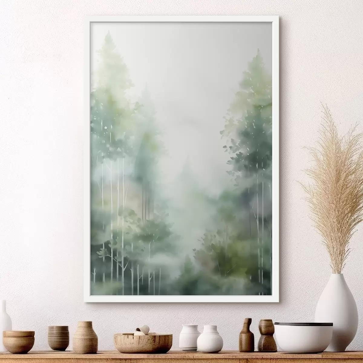 Poster Akvarellfestmény, amely magas fákkal és zöld lombokkal borított absztrakt erdőt ábrázol, lágy, tompított színekkel. Nr f46689