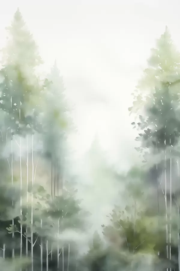 Poster Akvarellfestmény, amely magas fákkal és zöld lombokkal borított absztrakt erdőt ábrázol, lágy, tompított színekkel. Nr f46689