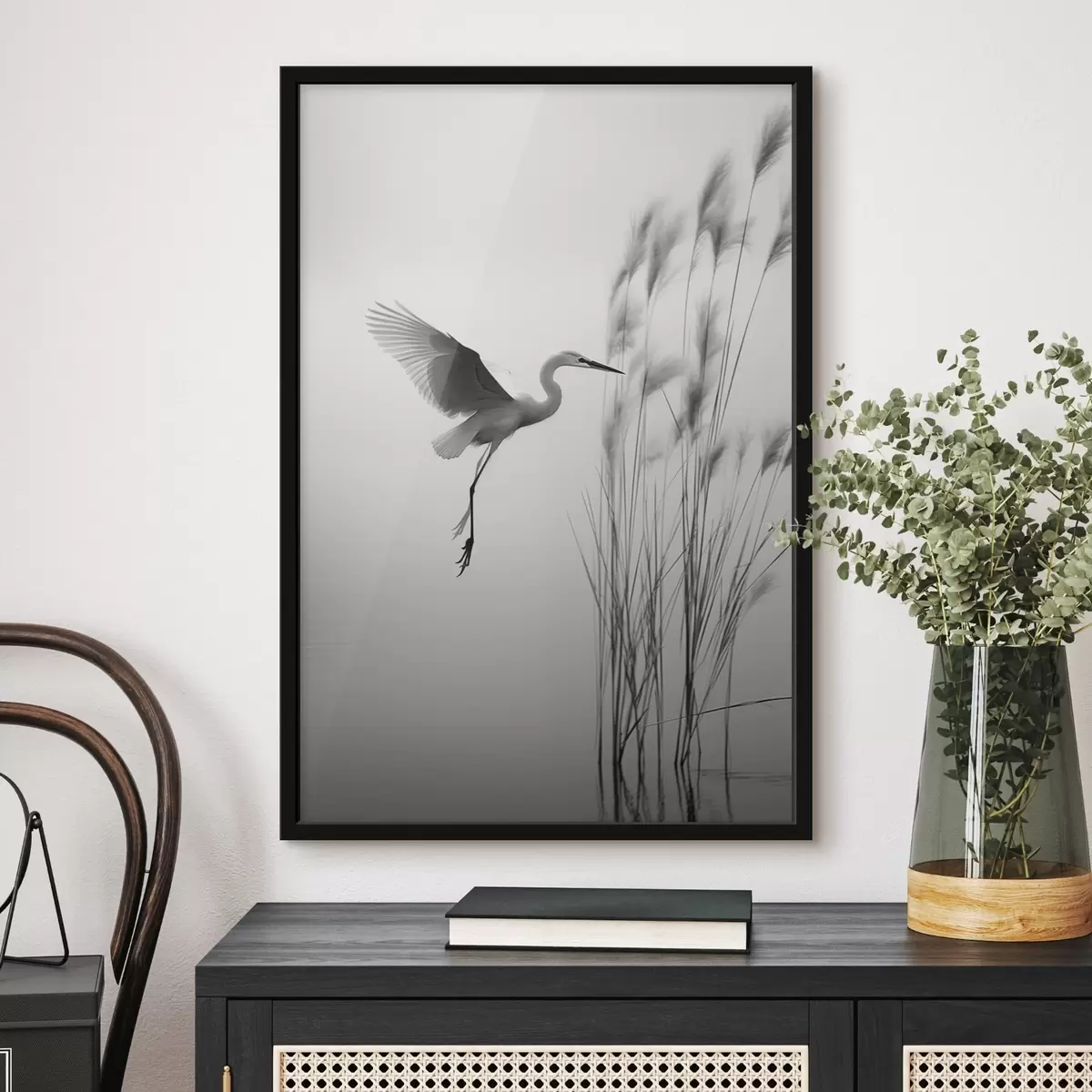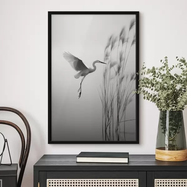 Poster Fehér gém, kiterjesztett szárnyakkal, magas nádas közelében repül, fekete-fehér minimalista kompozíció Nr f46693