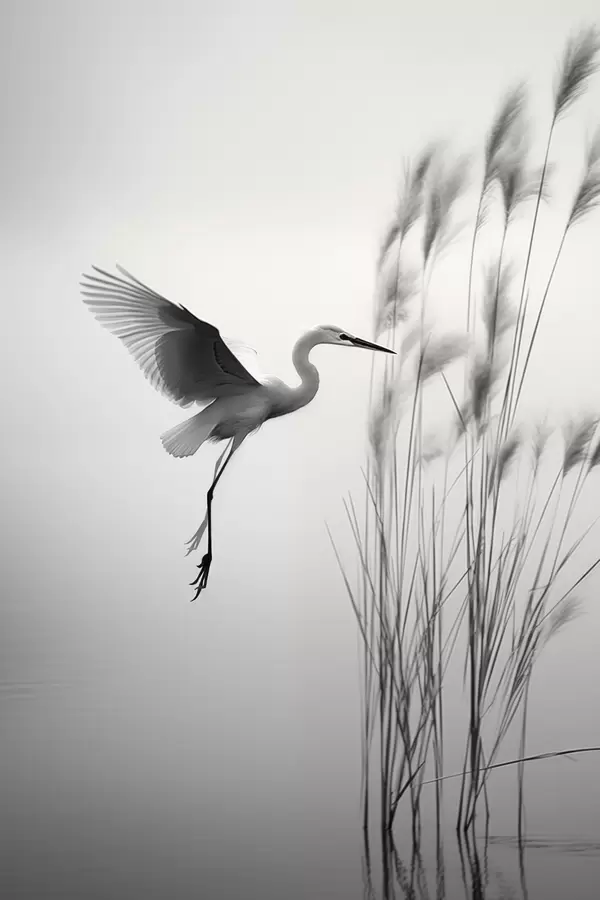 Poster Fehér gém, kiterjesztett szárnyakkal, magas nádas közelében repül, fekete-fehér minimalista kompozíció Nr f46693