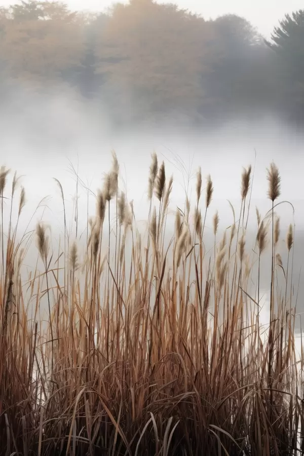 Poster Magas nádasok nőnek egy víztestben, a víz tükrözi a nádasokat, ködös háttér, lágy fény, természeti táj Nr f46696
