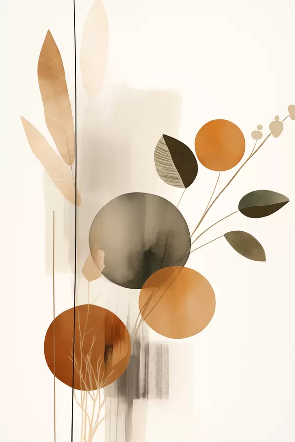 Plakát a sziklán Absztrakt festmény utánzat narancssárga és szürke körökkel, levelekkel és ágakkal, modern stílusban, akvarellhatással f46697