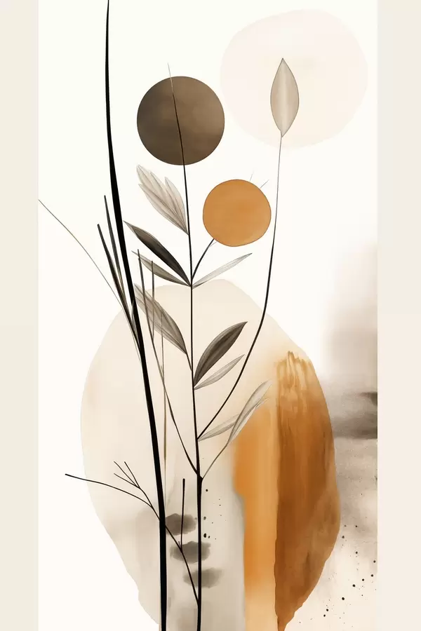 Plakát a sziklán Absztrakt festmény utánzat narancssárga és szürke körökkel, levelekkel és ágakkal, modern stílusban, akvarellhatással f46698