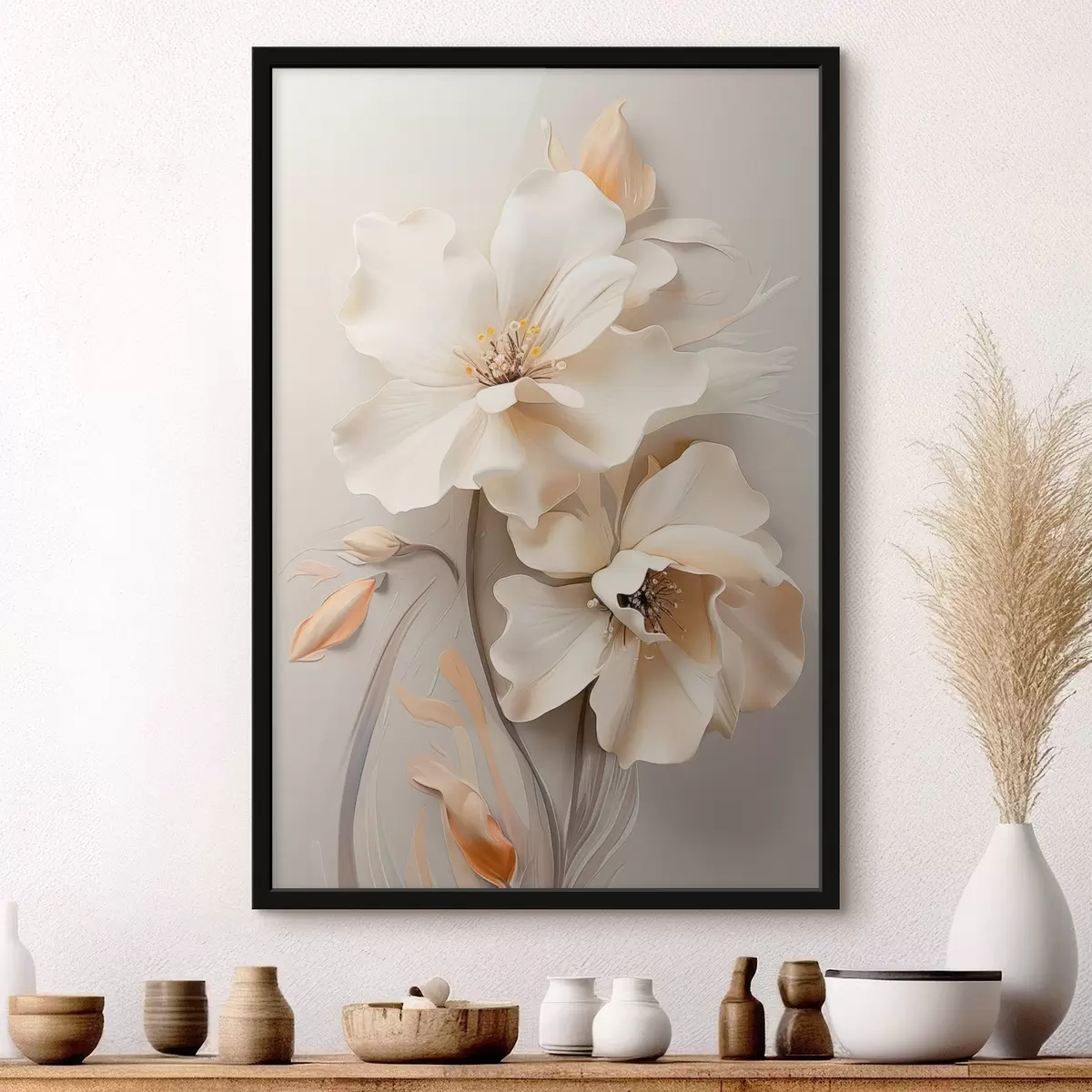 Poster Fehér virágok, lágy árnyékú szirmok, világos bézs háttér, elegáns kompozíció, minimalista stílus Nr f46700