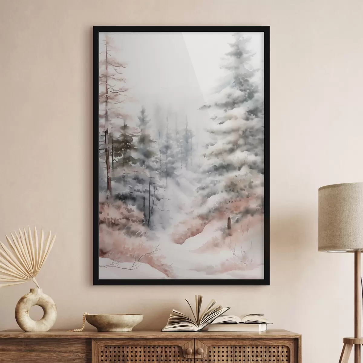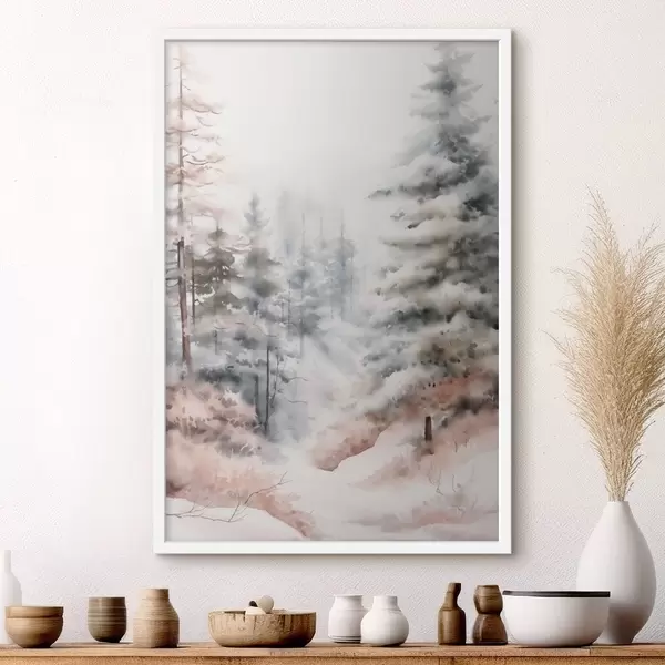 Poster Hóval borított magas fenyőfák, ködös erdőben állva, lágy, tompa téli táj Nr f46702