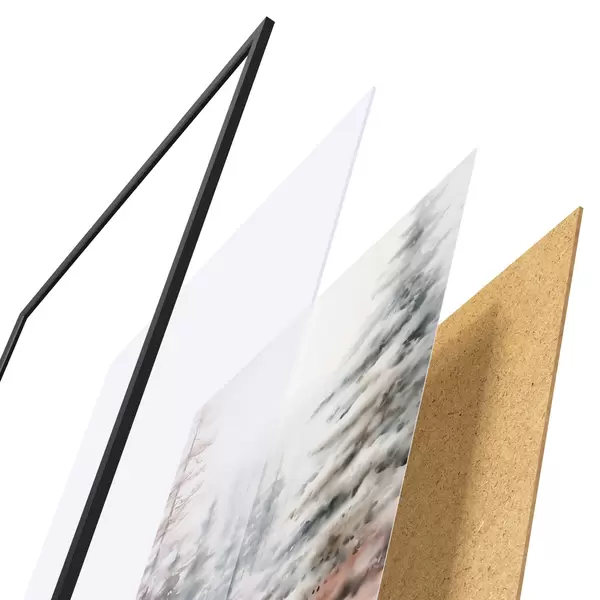 A poszter keretből, plexiből, nyomtatott képből és forgácslap hátlapból áll. A poszter a hátoldalon található rögzítőknek köszönhetően azonnal felakasztható a falra.