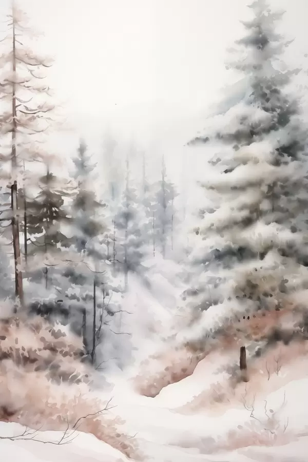 Poster Hóval borított magas fenyőfák, ködös erdőben állva, lágy, tompa téli táj Nr f46702