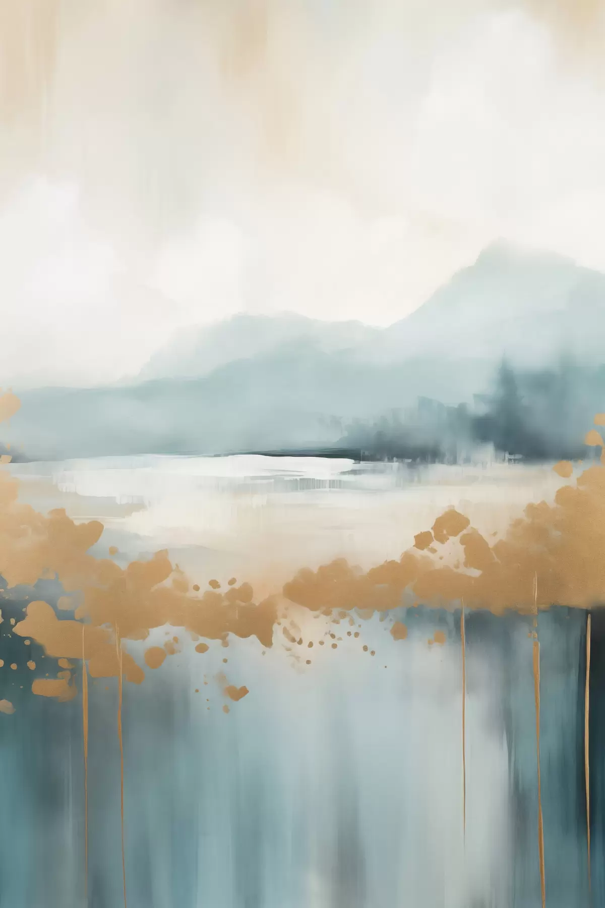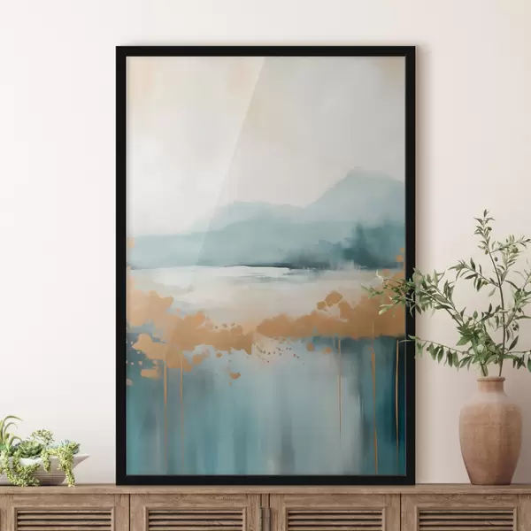Poster Absztrakt táj hegyekkel és tóval, türkizkék és texturált sárga színekkel, lágy ecsetvonásokkal, minimalista műalkotás Nr f46703