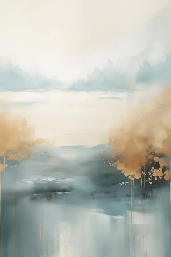 Poster Absztrakt táj hegyekkel és tóval, türkizkék és texturált sárga színekkel, lágy ecsetvonásokkal, minimalista műalkotás Nr f46704