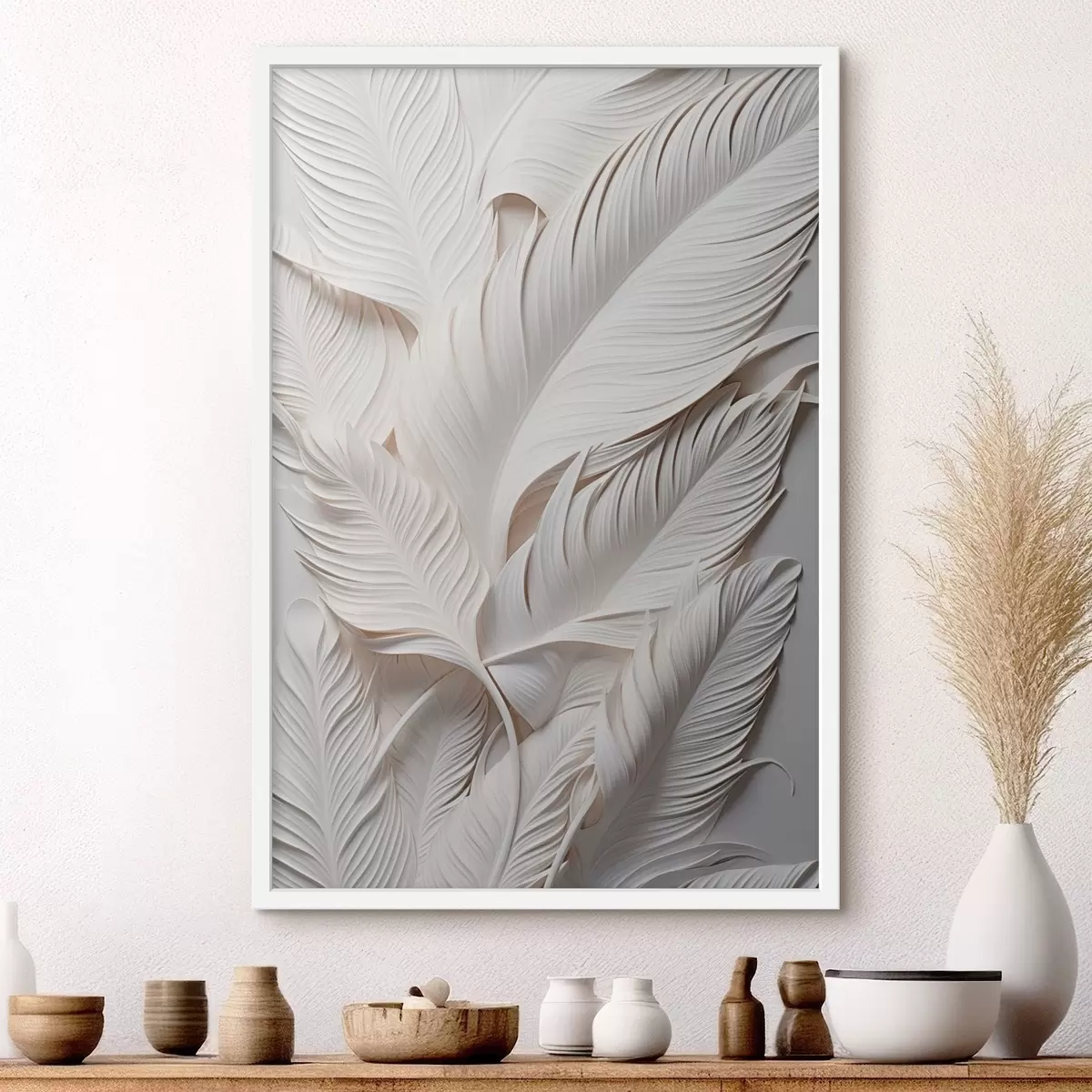 Poster Fehér levelek bonyolult részletekkel, texturált és réteges hatást keltve, minimalista művészet Nr f46706