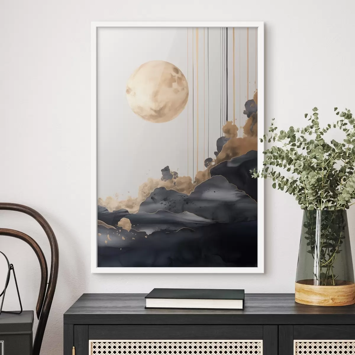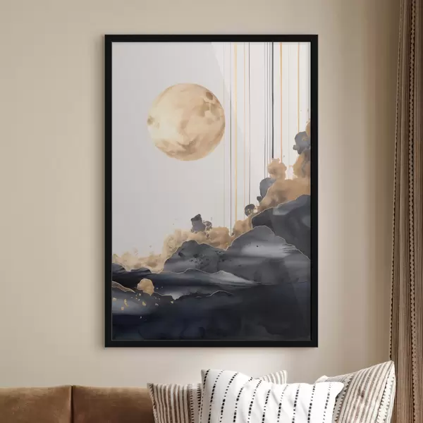 Plakát a sziklán Telihold fekete és texturált sárga felhőkkel, függőleges vonalakkal, absztrakt stílusban, minimalista és modern f46707
