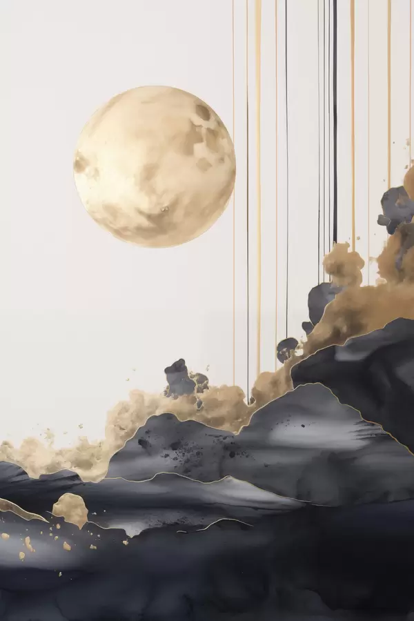 Poster Telihold fekete és texturált sárga felhőkkel, függőleges vonalakkal, absztrakt stílusban, minimalista és modern Nr f46707