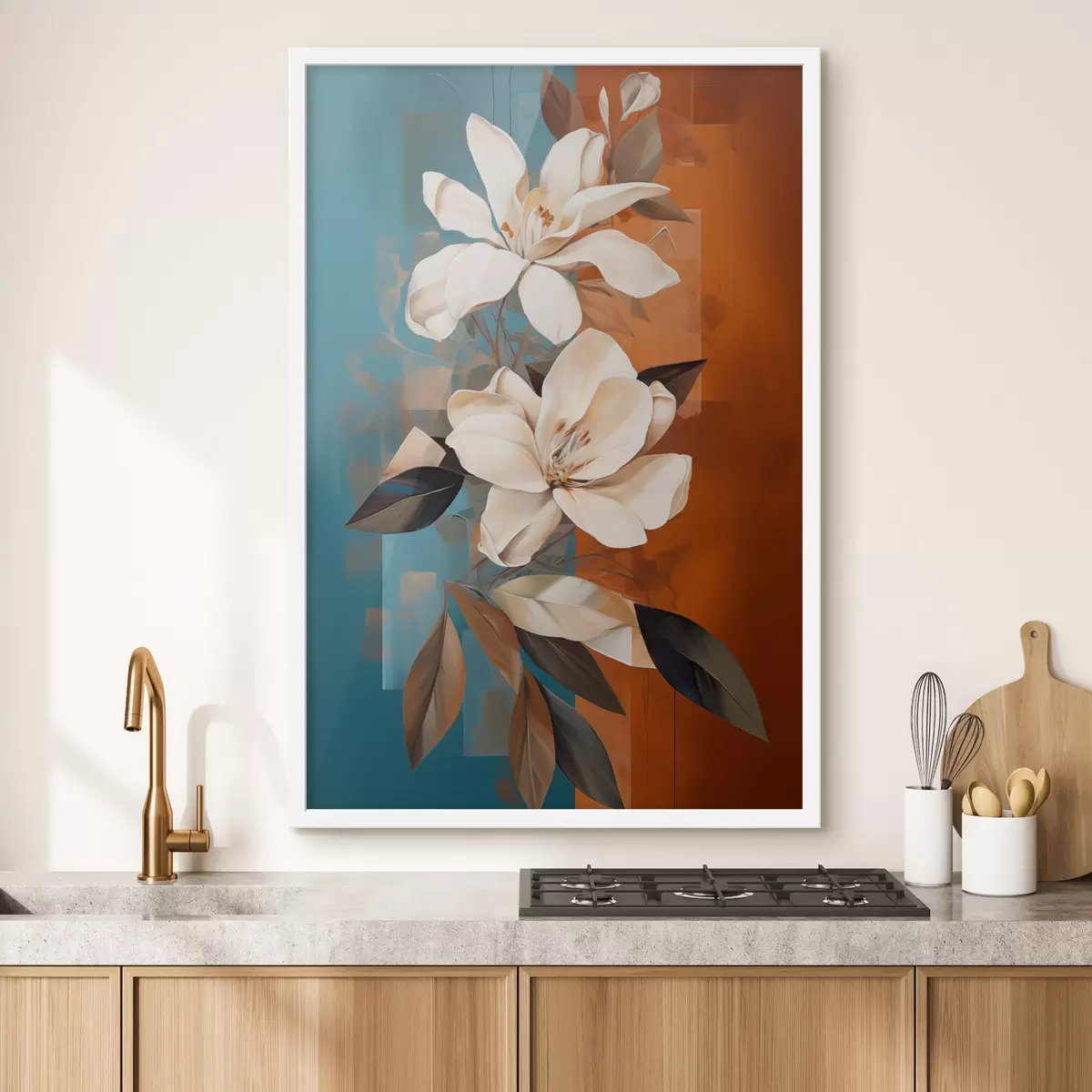 Plakát a sziklán Absztrakt fehér virágok és levelek barna és kék háttérrel, absztrakt formákkal, minimalista stílusban. f46710