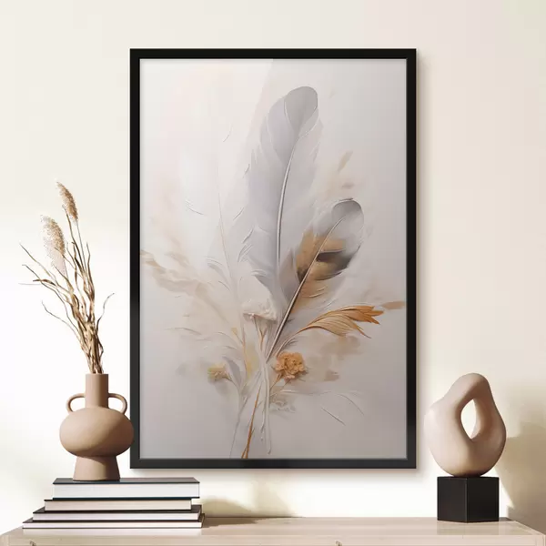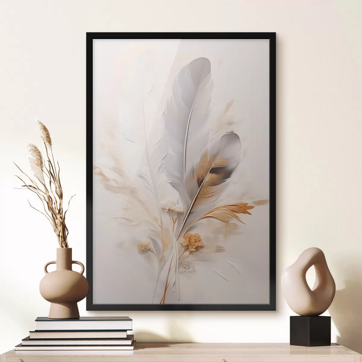 Plakát a sziklán Absztrakt tollak, bézs és barna tollakkal körülvéve, puha és finom, világos bézs háttérrel f46712