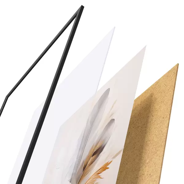 A poszter keretből, plexiből, nyomtatott képből és forgácslap hátlapból áll. A poszter a hátoldalon található rögzítőknek köszönhetően azonnal felakasztható a falra.