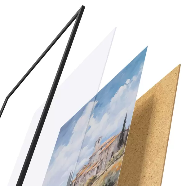 A poszter keretből, plexiből, nyomtatott képből és forgácslap hátlapból áll. A poszter a hátoldalon található rögzítőknek köszönhetően azonnal felakasztható a falra.