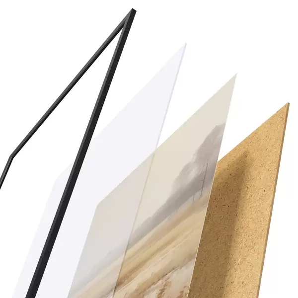 A poszter keretből, plexiből, nyomtatott képből és forgácslap hátlapból áll. A poszter a hátoldalon található rögzítőknek köszönhetően azonnal felakasztható a falra.