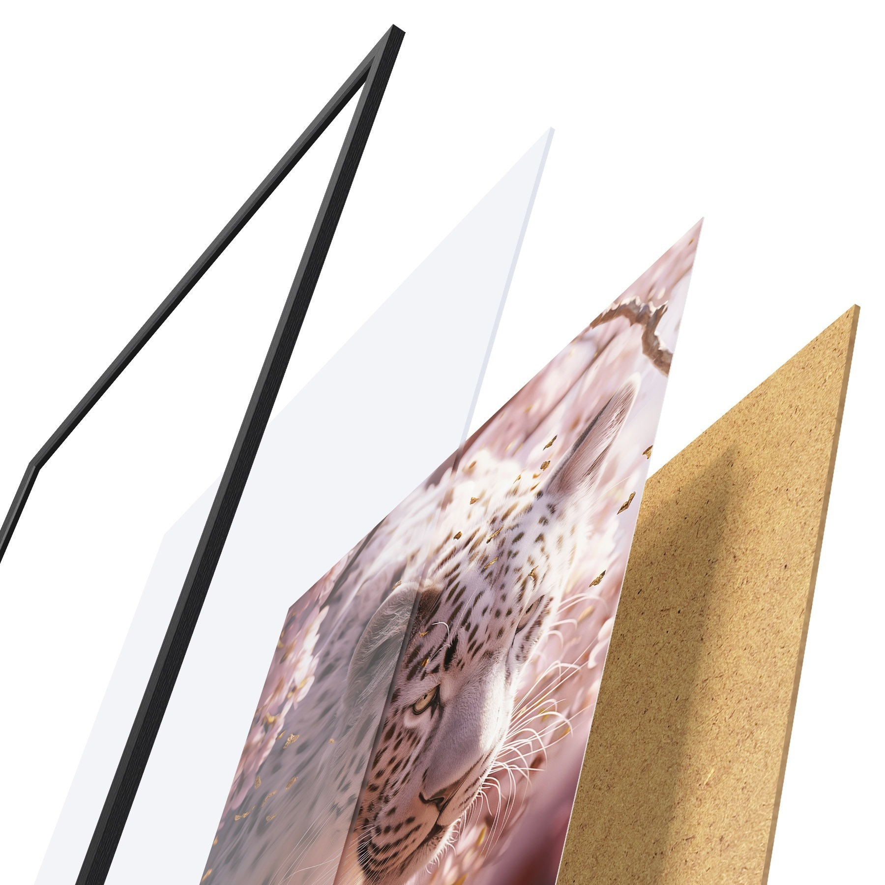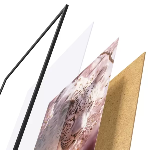 A poszter keretből, plexiből, nyomtatott képből és forgácslap hátlapból áll. A poszter a hátoldalon található rögzítőknek köszönhetően azonnal felakasztható a falra.