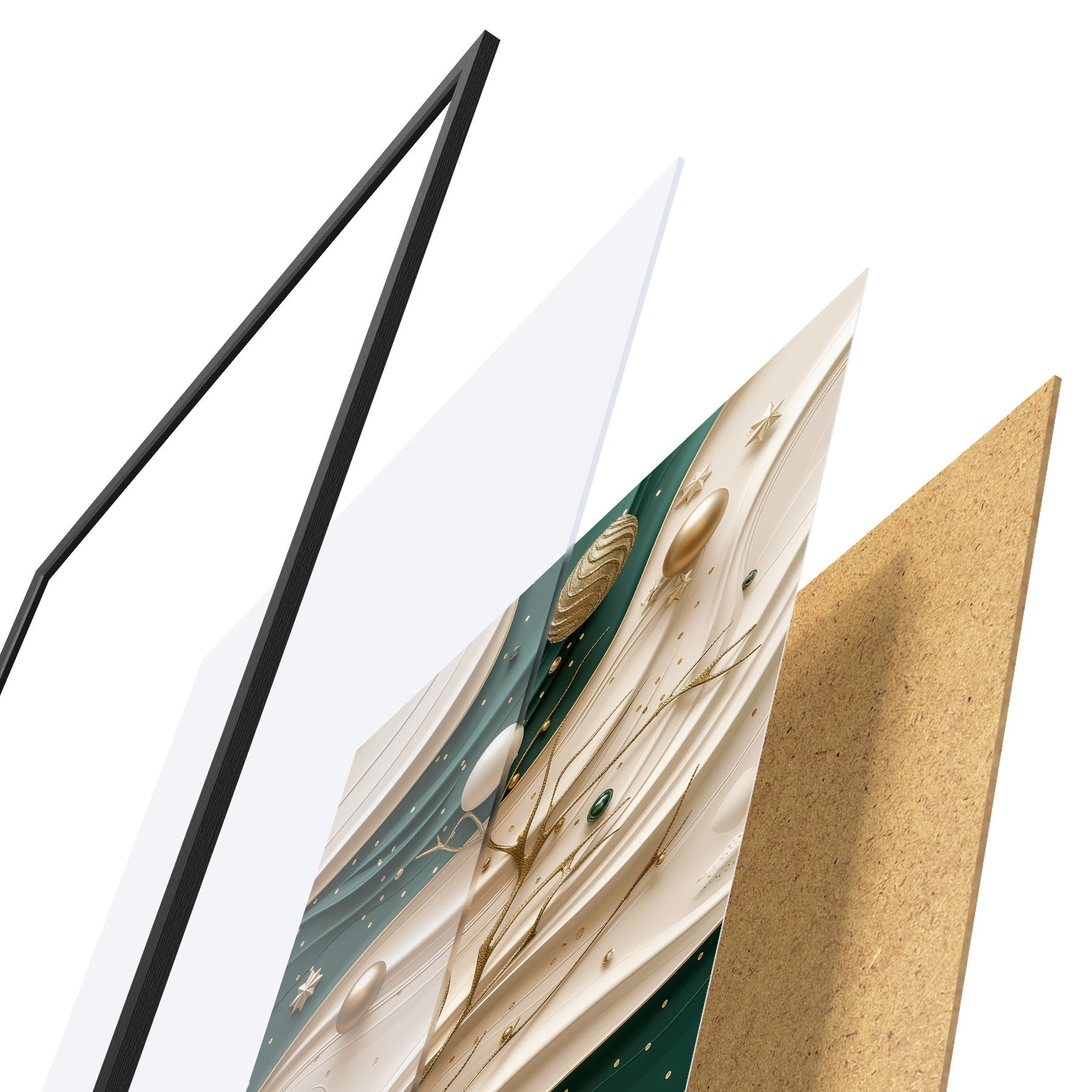 A poszter keretből, plexiből, nyomtatott képből és forgácslap hátlapból áll. A poszter a hátoldalon található rögzítőknek köszönhetően azonnal felakasztható a falra.