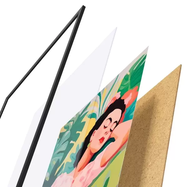 A poszter keretből, plexiből, nyomtatott képből és forgácslap hátlapból áll. A poszter a hátoldalon található rögzítőknek köszönhetően azonnal felakasztható a falra.
