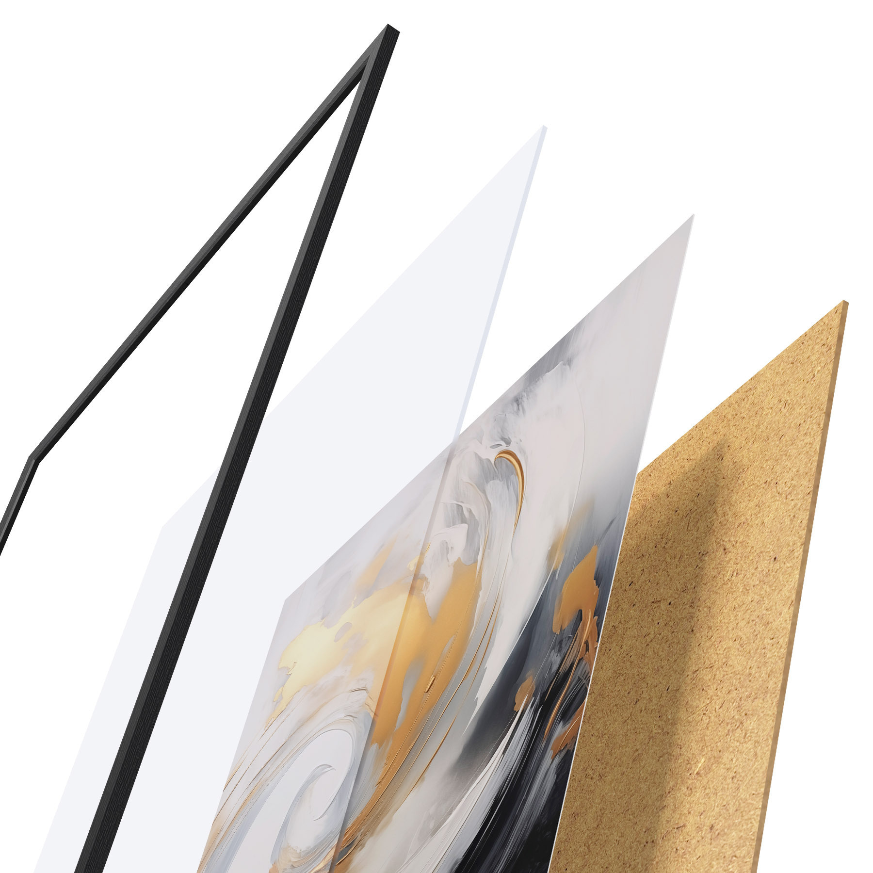 A poszter keretből, plexiből, nyomtatott képből és forgácslap hátlapból áll. A poszter a hátoldalon található rögzítőknek köszönhetően azonnal felakasztható a falra.