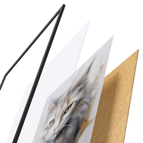 A poszter keretből, plexiből, nyomtatott képből és forgácslap hátlapból áll. A poszter a hátoldalon található rögzítőknek köszönhetően azonnal felakasztható a falra.