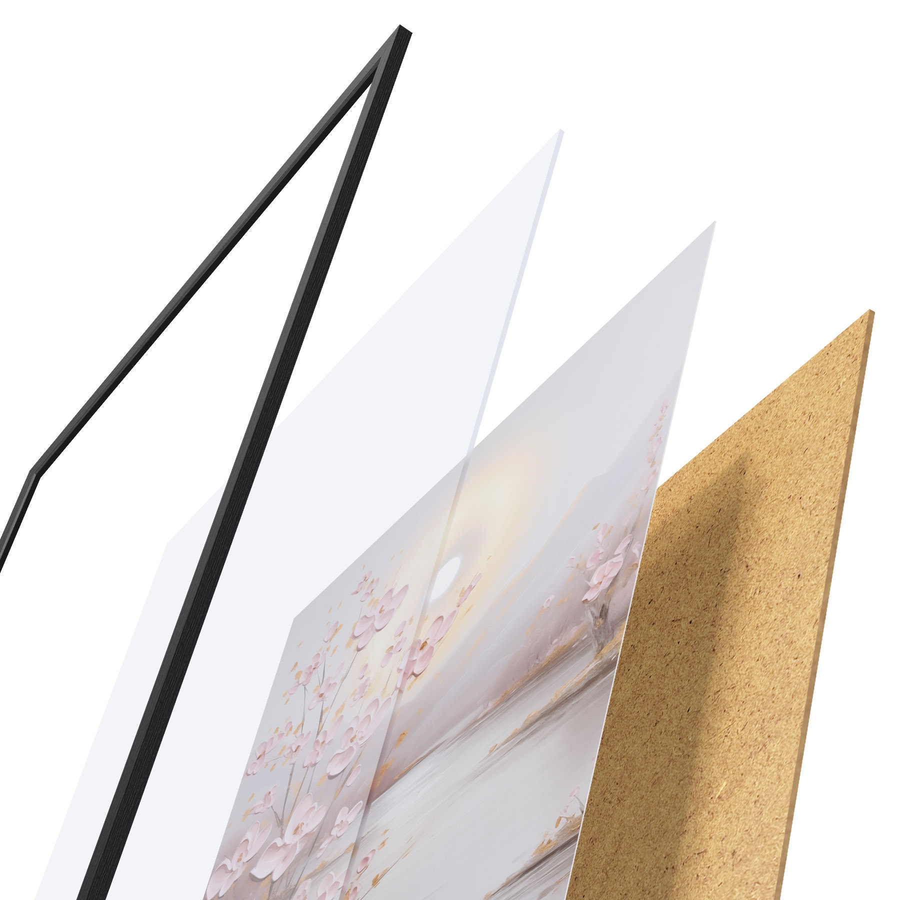 A poszter keretből, plexiből, nyomtatott képből és forgácslap hátlapból áll. A poszter a hátoldalon található rögzítőknek köszönhetően azonnal felakasztható a falra.
