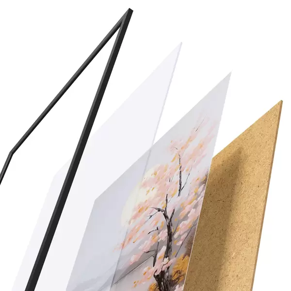A poszter keretből, plexiből, nyomtatott képből és forgácslap hátlapból áll. A poszter a hátoldalon található rögzítőknek köszönhetően azonnal felakasztható a falra.