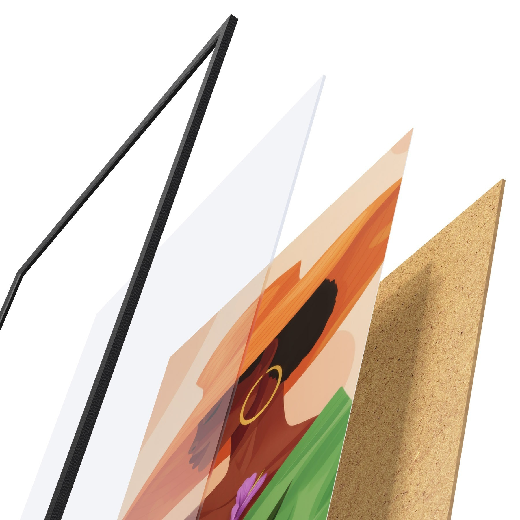 A poszter keretből, plexiből, nyomtatott képből és forgácslap hátlapból áll. A poszter a hátoldalon található rögzítőknek köszönhetően azonnal felakasztható a falra.