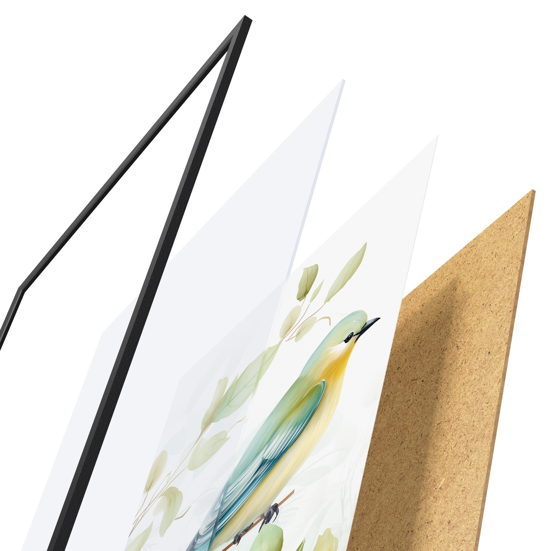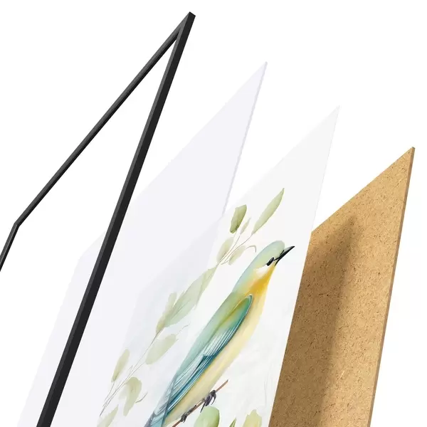 A poszter keretből, plexiből, nyomtatott képből és forgácslap hátlapból áll. A poszter a hátoldalon található rögzítőknek köszönhetően azonnal felakasztható a falra.