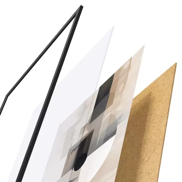 A poszter keretből, plexiből, nyomtatott képből és forgácslap hátlapból áll. A poszter a hátoldalon található rögzítőknek köszönhetően azonnal felakasztható a falra.