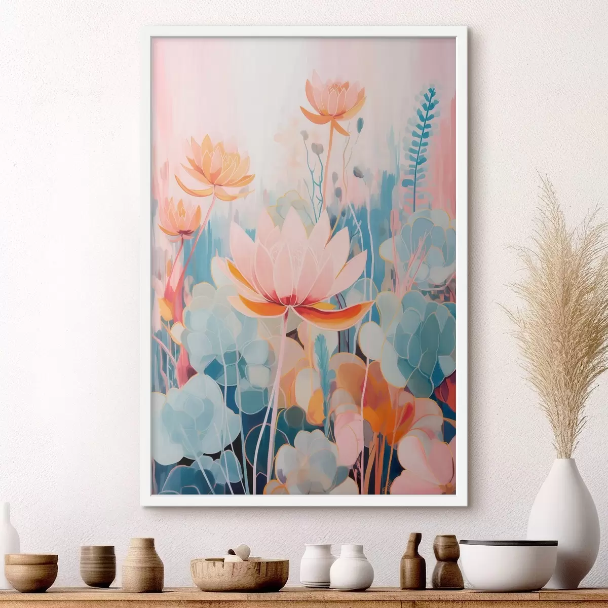 Plakát a sziklán Lótuszok és díszes lombozat rózsaszín és kék színpalettában f46929