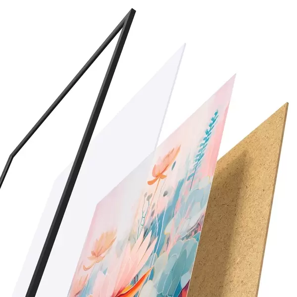 A poszter keretből, plexiből, nyomtatott képből és forgácslap hátlapból áll. A poszter a hátoldalon található rögzítőknek köszönhetően azonnal felakasztható a falra.