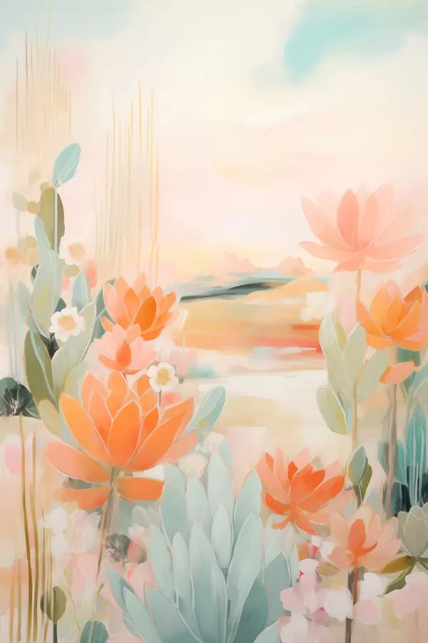 Poster Rózsaszín és kék árnyalatú virágos tájkép kortárs festészeti stílusban Nr f46931