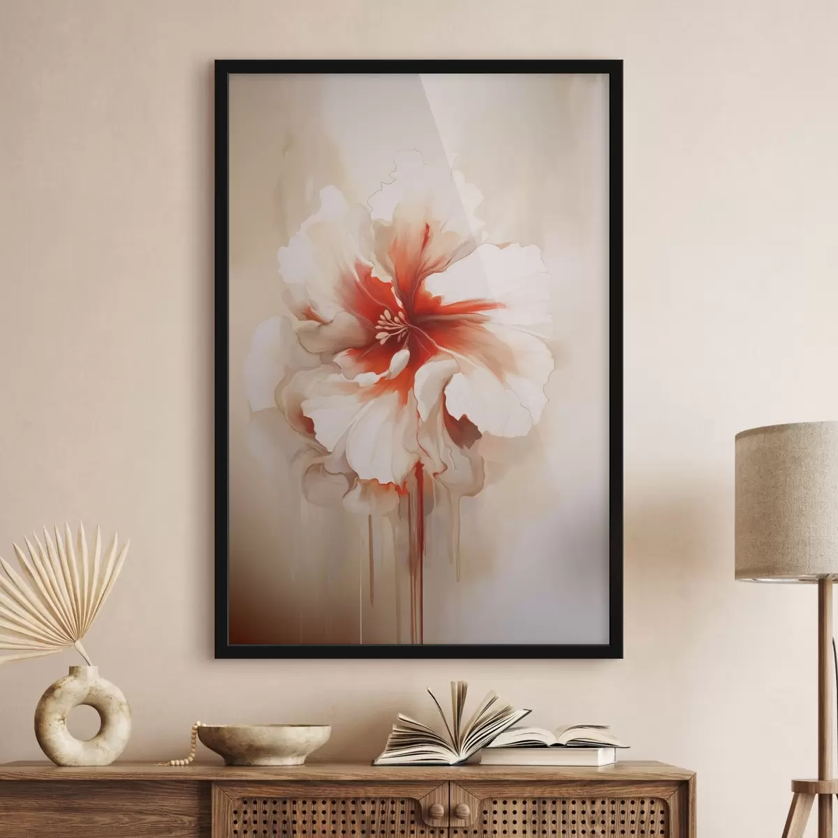 Plakát a sziklán Fehér és piros virág, félig átlátszó szirmokkal és lecsöpögő festékcseppekkel f46940