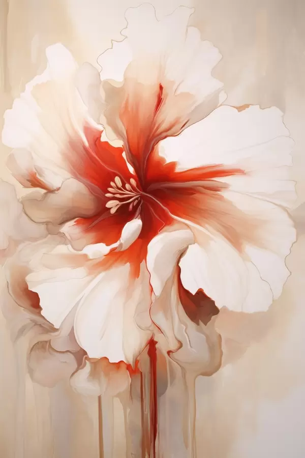 Poster Közelkép egy fehér és piros virágról, félig átlátszó szirmokkal és lecsöpögő festékcseppekkel Nr f46941
