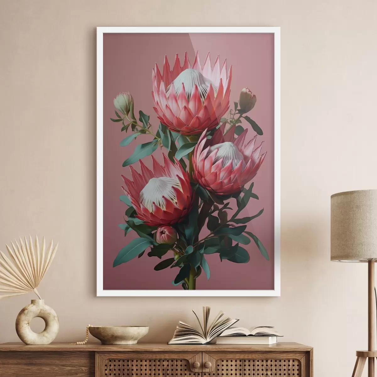 Poster Protea csokor piros szirmokkal és zöld levelekkel rózsaszín háttérrel Nr f46946