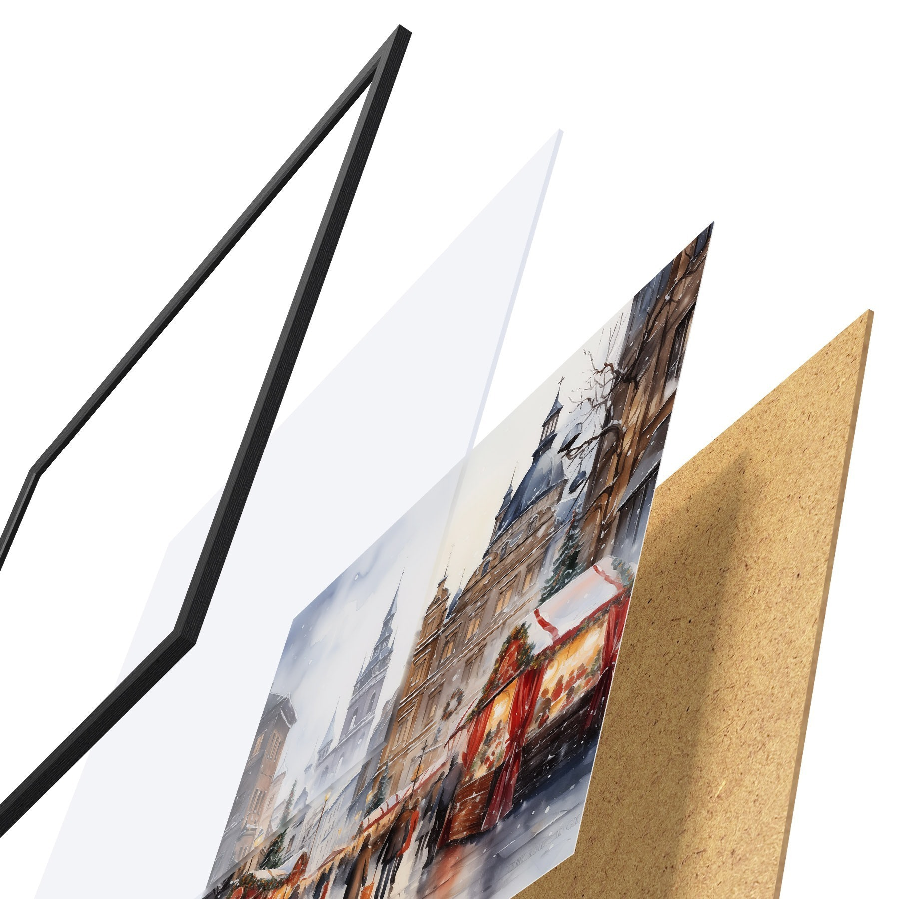 A poszter keretből, plexiből, nyomtatott képből és forgácslap hátlapból áll. A poszter a hátoldalon található rögzítőknek köszönhetően azonnal felakasztható a falra.