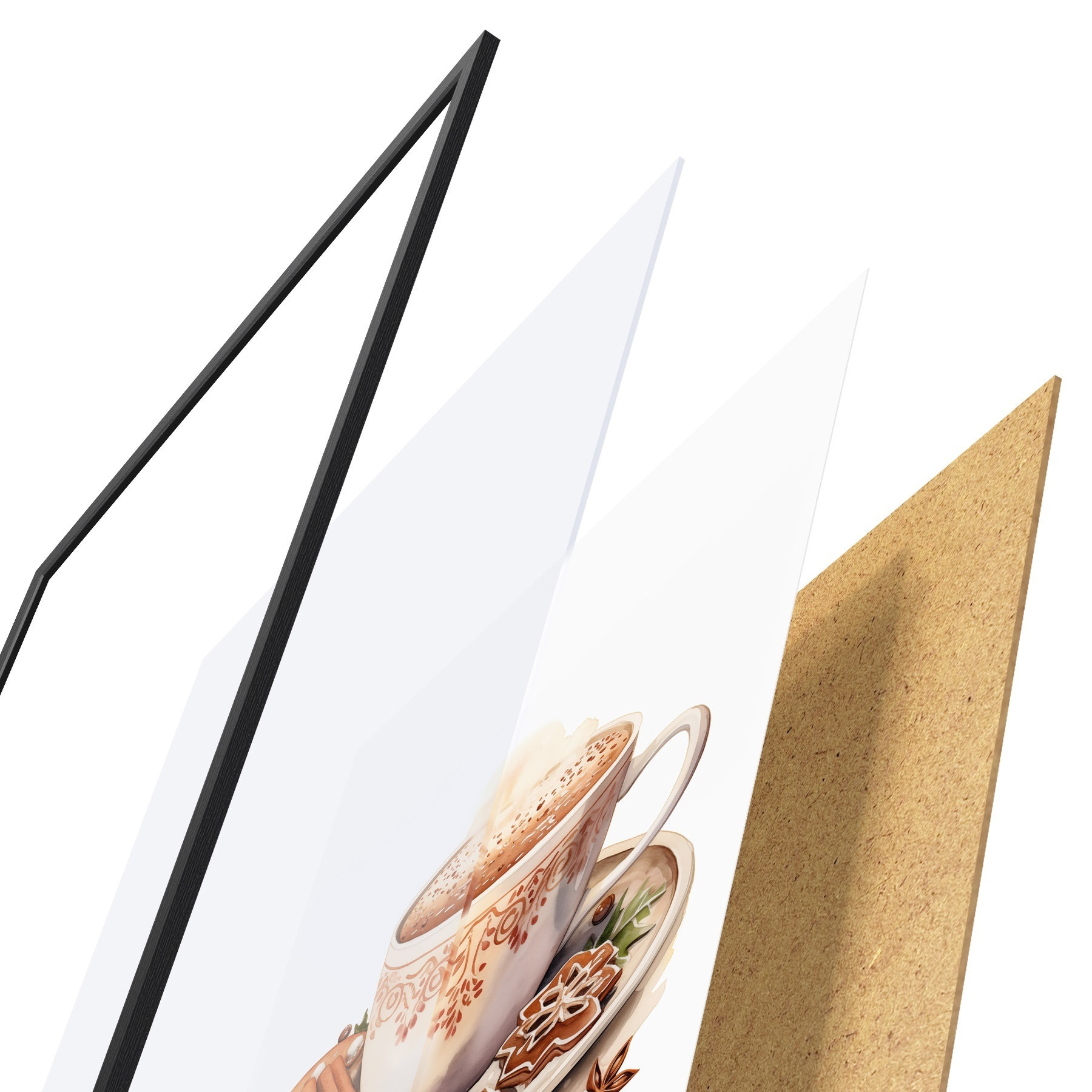 A poszter keretből, plexiből, nyomtatott képből és forgácslap hátlapból áll. A poszter a hátoldalon található rögzítőknek köszönhetően azonnal felakasztható a falra.