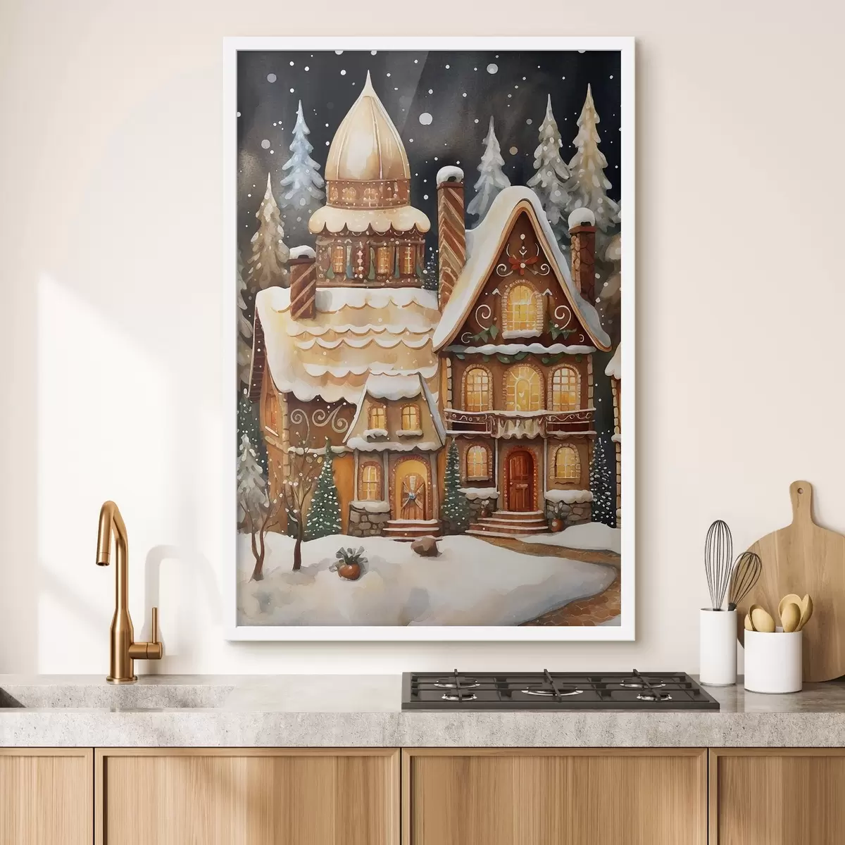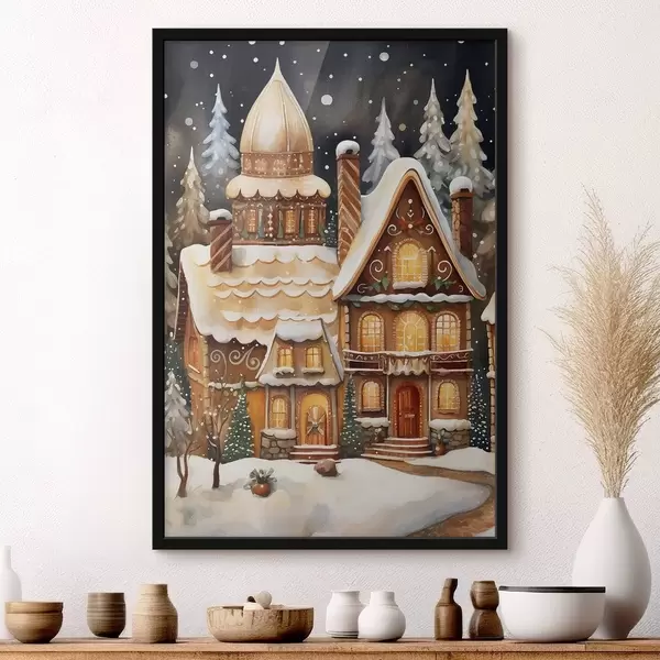 Plakát a sziklán Hóval borított házak az erdőben f46985