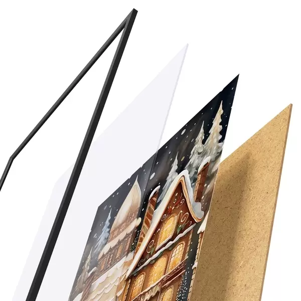 A poszter keretből, plexiből, nyomtatott képből és forgácslap hátlapból áll. A poszter a hátoldalon található rögzítőknek köszönhetően azonnal felakasztható a falra.