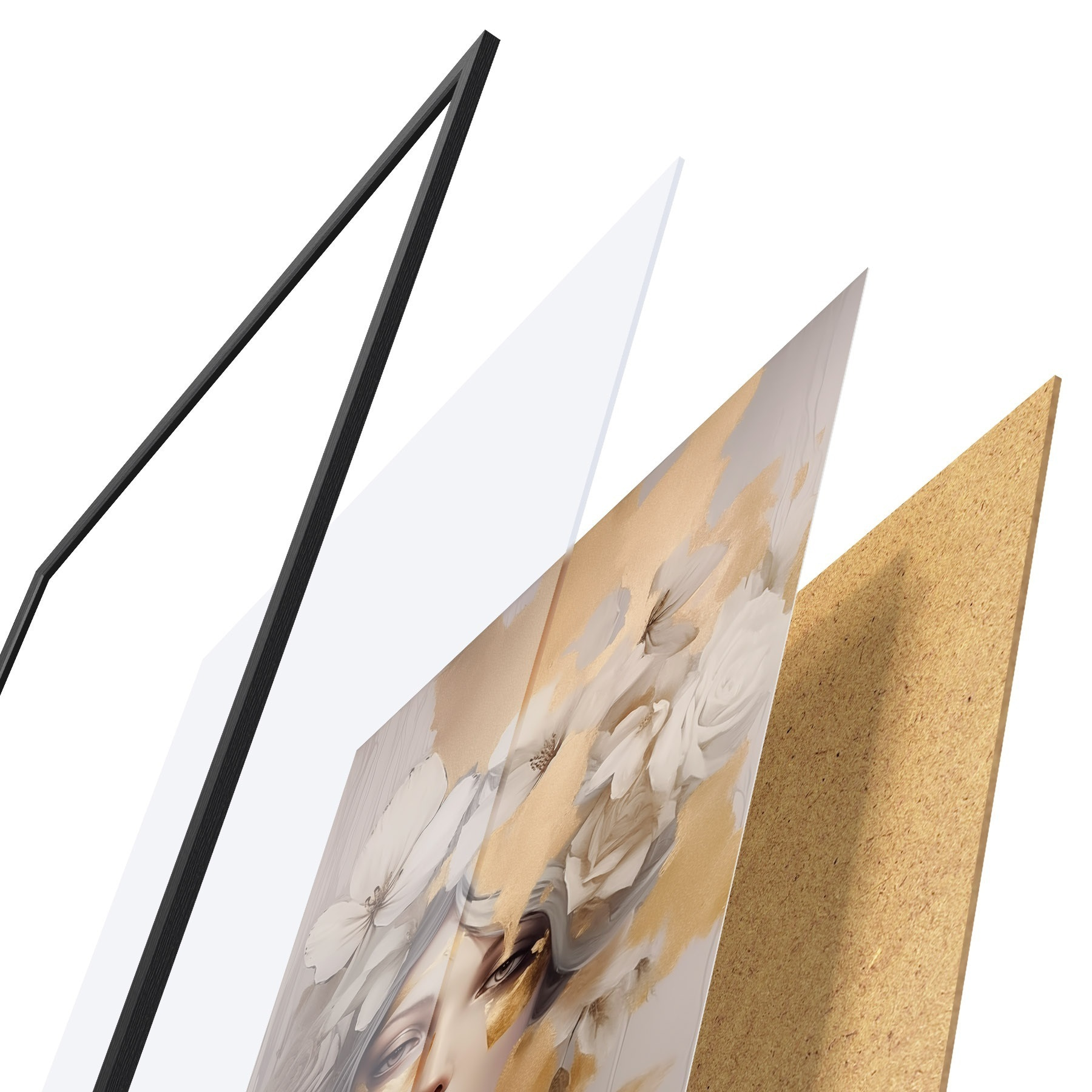 A poszter keretből, plexiből, nyomtatott képből és forgácslap hátlapból áll. A poszter a hátoldalon található rögzítőknek köszönhetően azonnal felakasztható a falra.