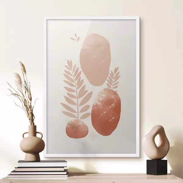 Plakát a sziklán Absztrakt formák, texturált kövek és levelek halvány barack- és terrakotta árnyalatokban, minimalista, krém színű háttérrel. f47012