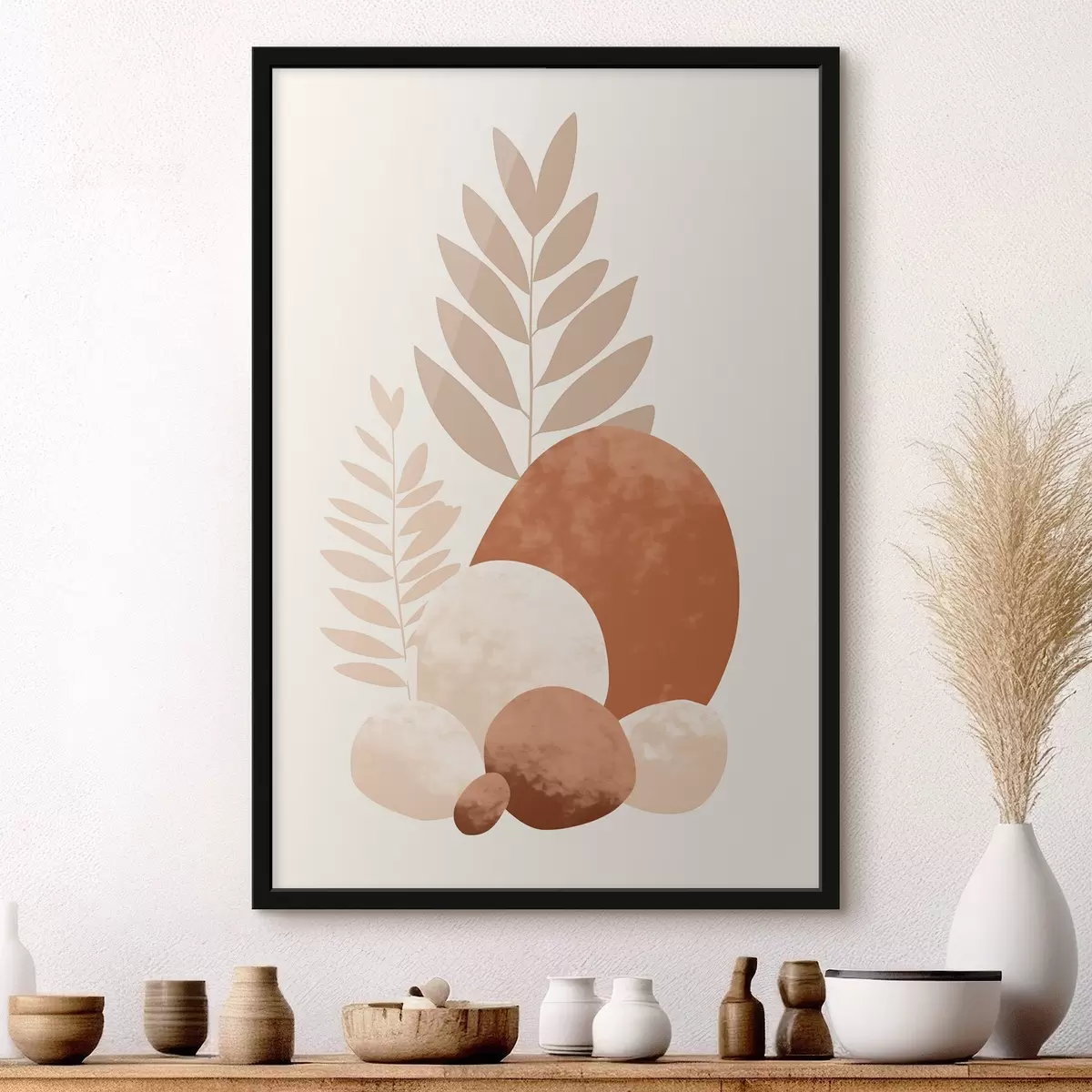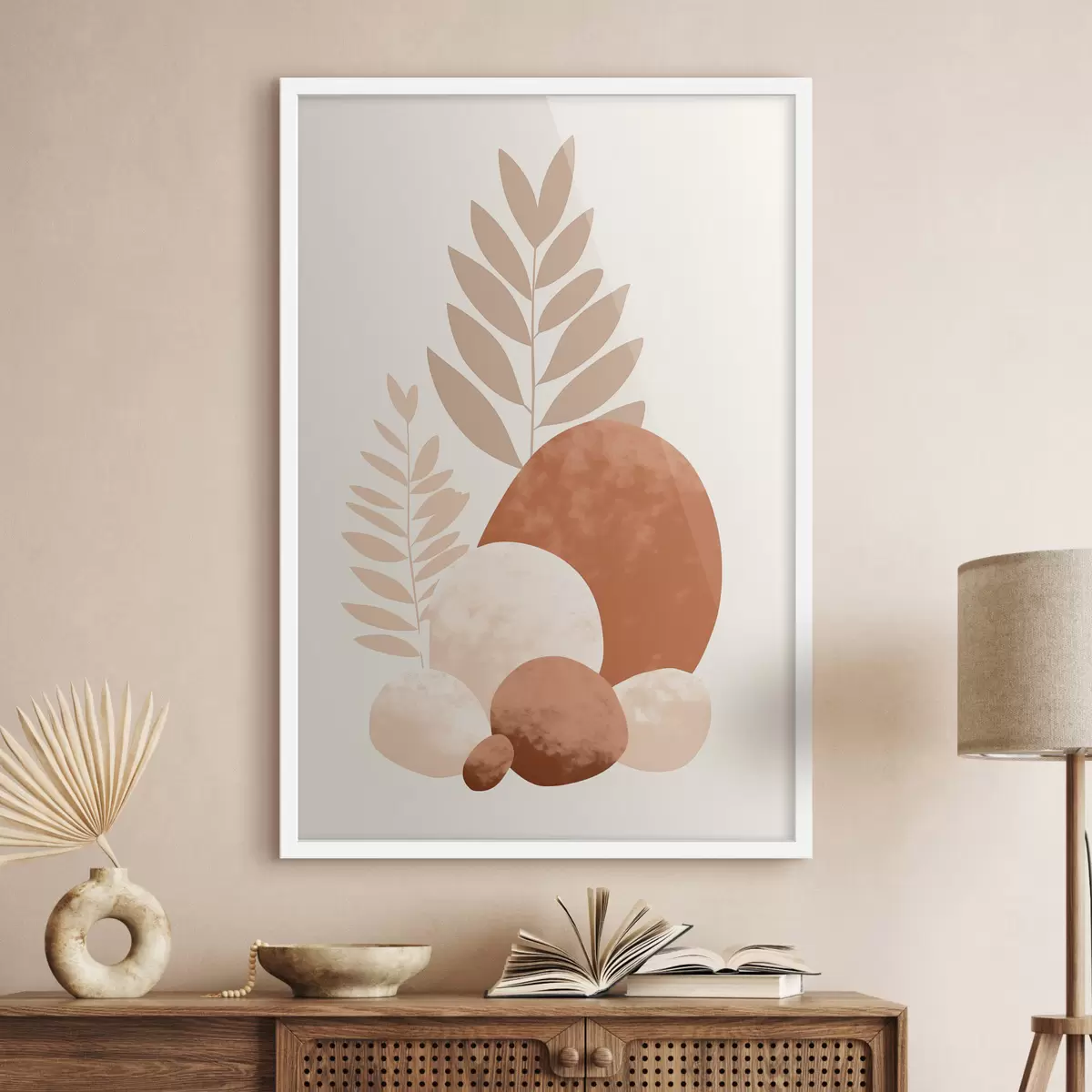 Plakát a sziklán Absztrakt formák, texturált kövek és levelek halvány barack- és terrakotta árnyalatokban, minimalista, krém színű háttérrel. f47013